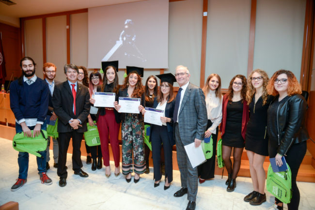 Le tre ragazze diplomate quest’anno con Bernard Foing, Cesare Barbieri e Luigi Alici