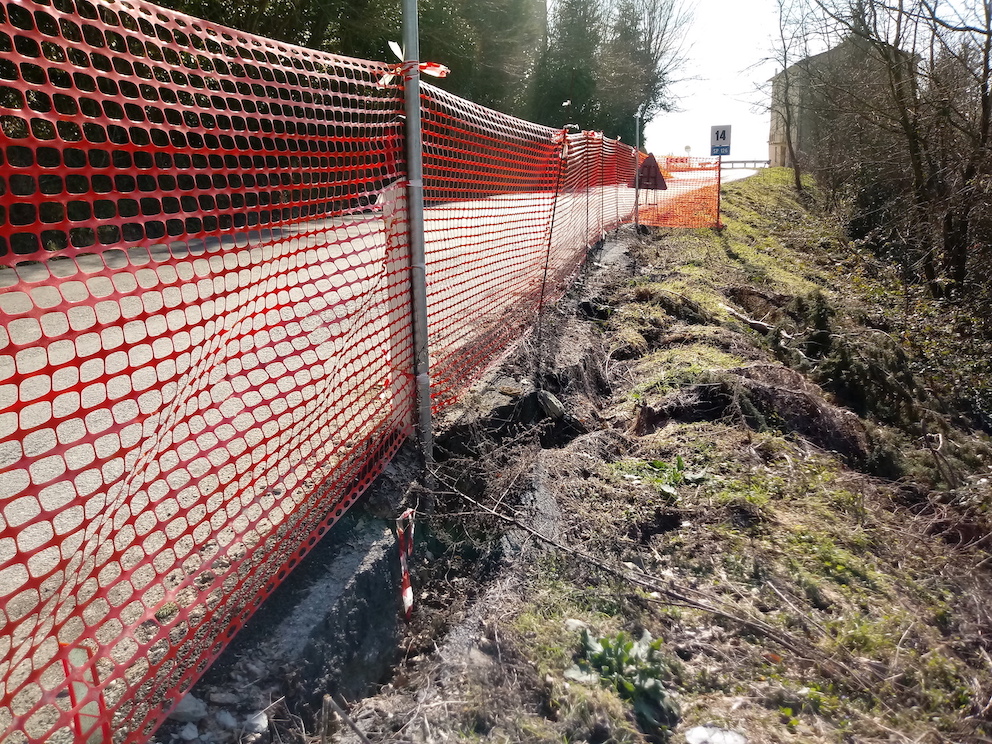 La frana, presente già da alcuni anni e tamponata con interventi di ricarica, ha subito un aggravamento, con il cedimento di una porzione di valle della sede stradale pavimentata e della sovrastruttura e, quindi, è stato necessario restringere la carreggiata per evitare il passaggio degli automezzi a ridosso della stessa.