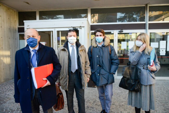 Alcuni degli avvocati di parte civile. Da sinistra: Narciso Ricotta, Olindo Dionisi, Massimiliano Cofanelli e Paola Medori dopo l’udienza di questo pomeriggio in tribunale