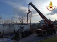 CORRIDONIA – I vigili del fuoco hanno usato una autogru per rimettere sulla carreggiata il mezzo