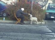 MACERATA – Un uomo si è seduto a lato della rotatoria per dare il latte alla pecorella. Sono intervenuti i vigili. FOTO