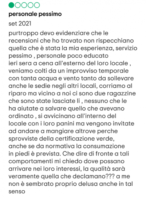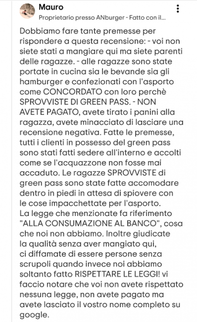 «Abbiamo ricevuto una falsa recensione su Tripadvisor solo perchè abbiamo rispettato le regole sul Green Pass, non facendo sedere all’interno due ragazze che ne erano sprovviste». Parole amare quelle di Mauro Ugolini, titolare di Anburger, locale di piazza del Papa specializzato in birre artigianali e panini farciti. Il commento negativo sul web è arrivato dopo l’episodio accaduto domenica sera, quando la città è stata investita da un violento temporale, attorno alle 19,30. I clienti seduti nei tavolini esterni e dotati di Green Pass sono stati fatti accomodare all’interno, per poter terminare la cena. Due ragazzine, «sicuramente minorenni, sui 14-15 anni», erano senza certificazione verde. Regola vuole che la consumazione all’interno, se non al bancone («di cui però siamo sprovvisti») non può essere fatta. E qui partono due versioni differenti. Quella di Ugolini: «Abbiamo detto alla ragazze di attendere nel locale, in piedi, finché la pioggia non si fosse attenuata. Intanto, abbiamo preparato un sacchetto con l’asporto con i piatti ordinati. Dopo dieci minuti, sono arrivati al locale i familiari delle due ragazze. A un certo punto hanno tirato alla mia collaboratrice i panini della doggy bag addosso e se ne sono andati via senza pagare, dicendo che avrebbero lasciato recensioni negative fino a che il locale non avesse chiuso in maniera definitiva. Noi, per le giovani clienti, abbiamo fatto tutto quello che abbiamo potuto, ma le regole vanno rispettate. Cosa che non hanno fatto gli adulti, andando via senza pagare la cena. Sporgerò denuncia». La recensione su Tripadvisor è stata lasciata il giorno dopo l’episodio, da un utente con il nickname di una donna. Per Ugolini si tratta di una delle due persone adulte arrivate al locale «che, dunque, non ha neanche consumato. Si è spacciata per cliente». «Purtroppo – ecco il feedback – devo evidenziare che le recensioni che ho trovato non rispecchiano quella che è stata la mia esperienza, servizio pessimo , personale poco educato ieri sera a cena all’esterno del loro locale, veniamo colti da un improvviso temporale con tanta acqua e vento tanto da sollevare anche le sedie negli altri locali, corriamo al riparo ma vicino a noi ci sono due ragazzine che sono state lasciate li , nessuno che le ha aiutate a salvare quello che avevano ordinato, si avvicinano all’interno del locale con i loro panini ma vengono invitate ad andare a mangiare altrove perchè sprovviste della certificazione verde, anche se da normativa la consumazione in piedi è prevista. Che dire di fronte a tali comportamenti mi chiedo dove possano arrivare nei loro interessi».  Su Tripadvisor è arrivata la risposta di Ugolini che ha dato la propria versione dei fatti su quanto accaduto domenica.