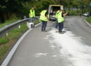 TREIA – Il liquido è stato seminato da un trattore lungo la careggiata. Nulla di grave per il centauro