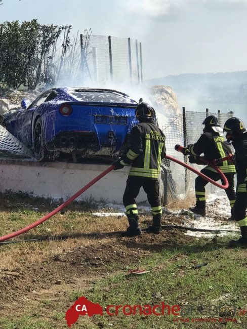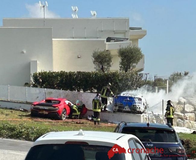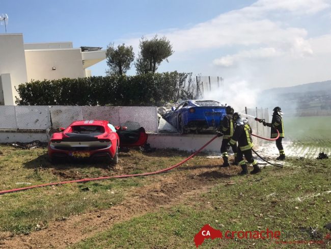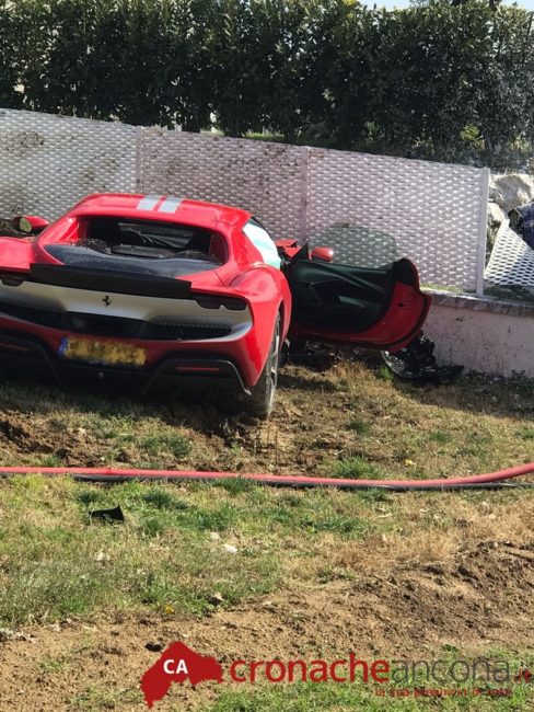 Incidente tra supercar in via Molino Basso a Osimo. E’ successo intorno a mezzogiorno, quando due Ferrari si sono schiantate entrambe contro il muro di recinzione di alcune abitazioni. Una, è letteralmente volata in aria, abbattendo anche una cancellata per poi prendere fuoco.