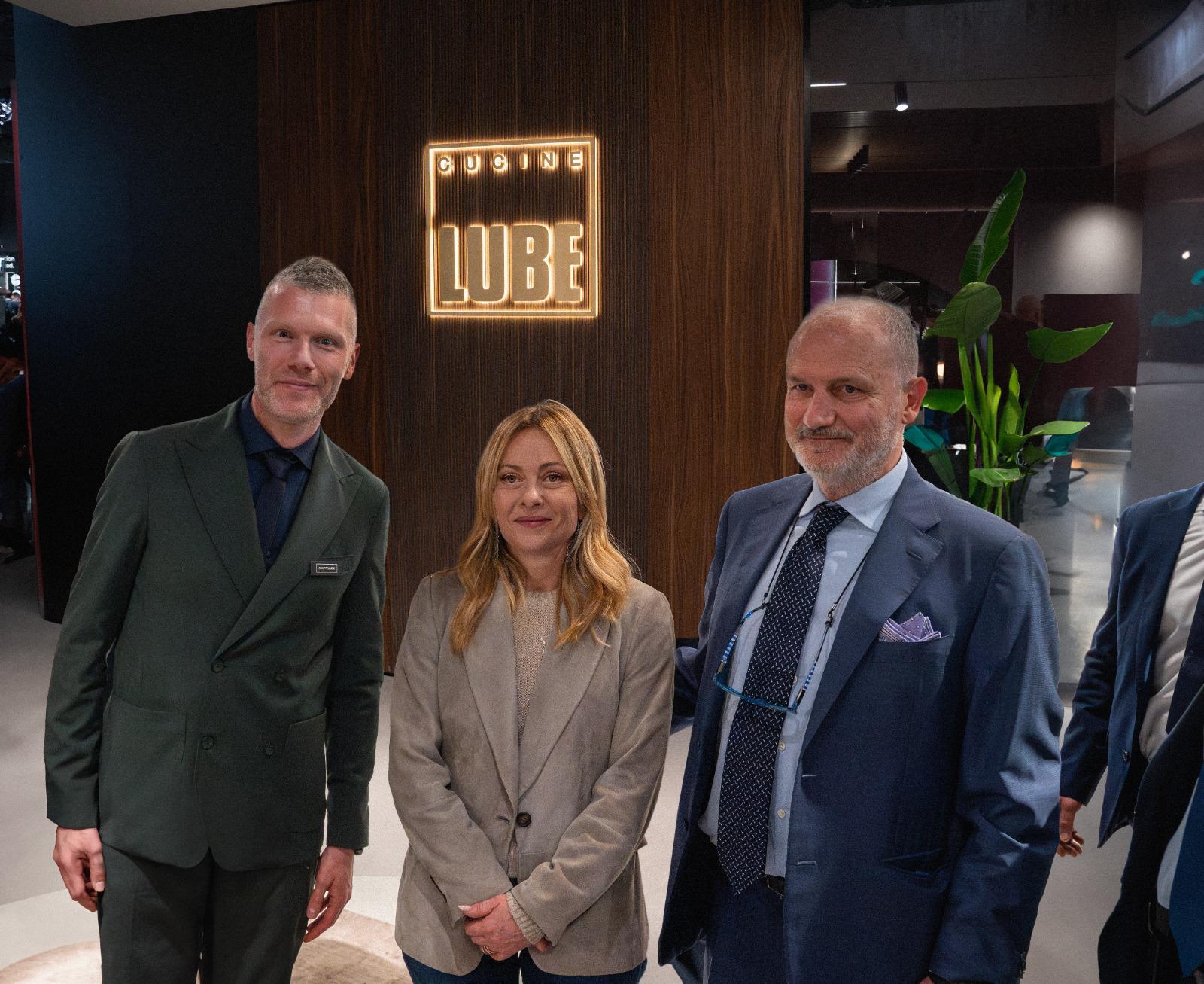 La premier Giorgia Meloni visita lo stand della Lube alla 64esima edizione del Salone del Mobile a Milano. La presidente del consiglio ha incontrato l’amministratore delegato di Gruppo Lube, Fabio Giulianelli, e la proprietà dell’azienda treiese.