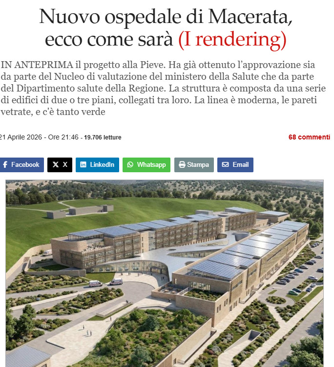 "Il nuovo ospedale è un obiettivo che appartiene a tutti i maceratesi": falso. Basta leggere i commenti al precedente articolo sul rendering per capire che molti maceratesi chiedono di investire nella riqualificazione di quello esistente e nell'assunzione di Medici e Infermieri per abbattere le liste di attesa, evitando nel contempo una smisurata colata di cemento e asfalto che si porterà via per sempre l'ultima zona verde di Macerata. Spiace vedere come sulle cose veramente importanti gli esponenti di tutti gli schieramenti si muovano con il pilota automatico imposto dall'alto.